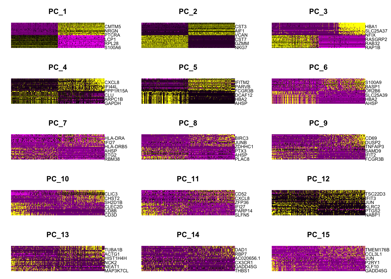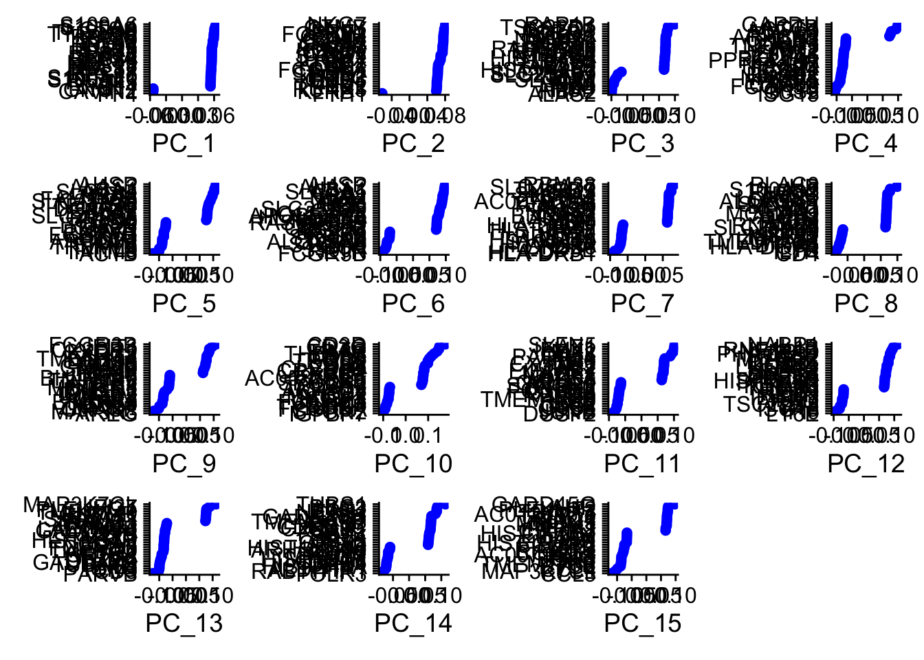 VizDimLoadings(pbmc_pca, dims = 1:15, reduction = "pca")