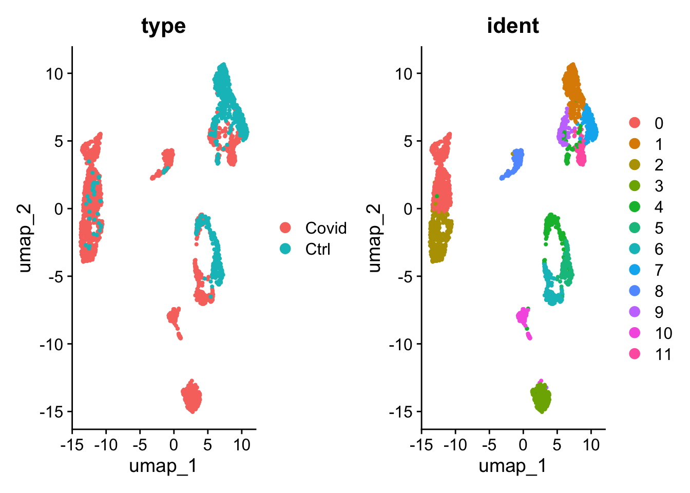 DimPlot(pbmc_umap, reduction = "umap", group.by = c("type", "ident"))