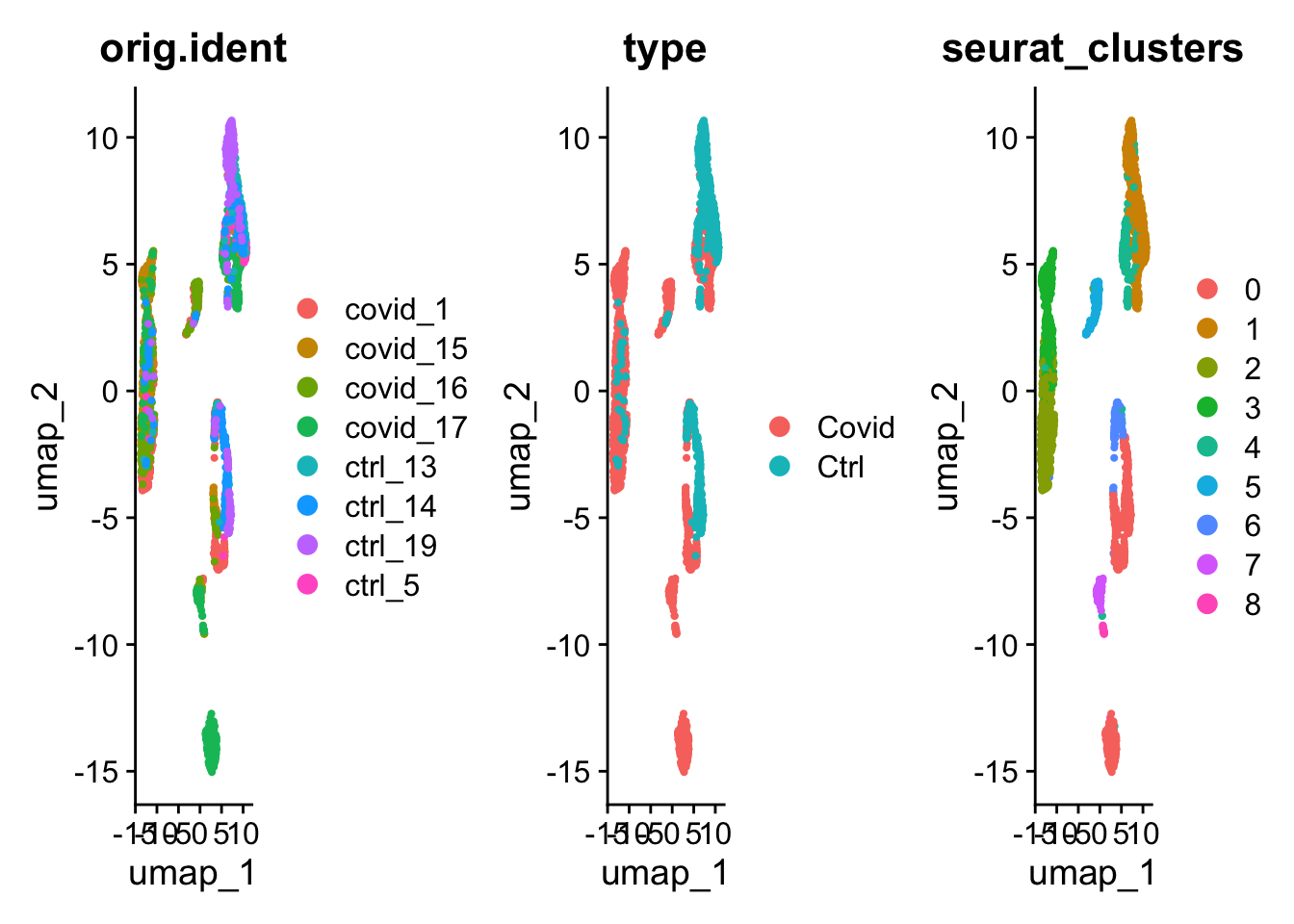 DimPlot(pbmc_integrated, reduction = "umap", group.by = c("orig.ident", "type", "seurat_clusters"))