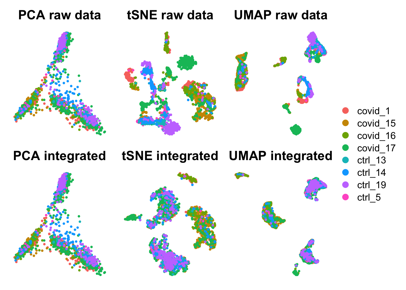 DimPlot(pbmc_integrated, reduction = "pca", group.by = "orig.ident")+NoAxes()+ggtitle("PCA integrated"),