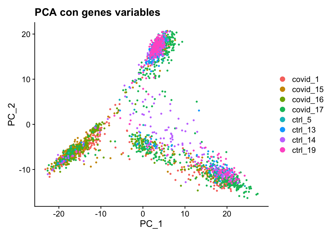 DimPlot(pbmc_pca, reduction = "pca") + ggtitle("PCA con genes variables")