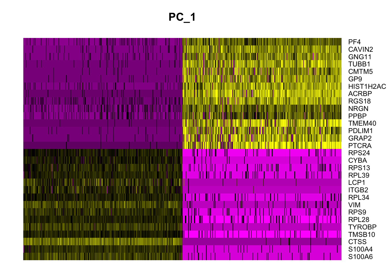 DimHeatmap(pbmc_pca, dims = 1, cells = 500, balanced = TRUE)