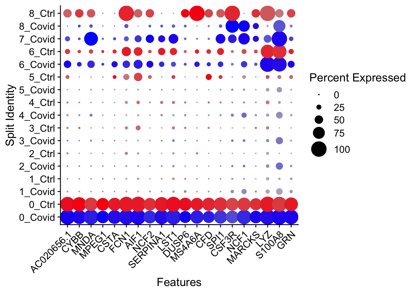Si un gen aparece con puntos grandes y coloreados en ambos grupos (Control y Covid), significa que es un marcador conservado: se expresa de manera robusta en ese cluster sin importar la condición.