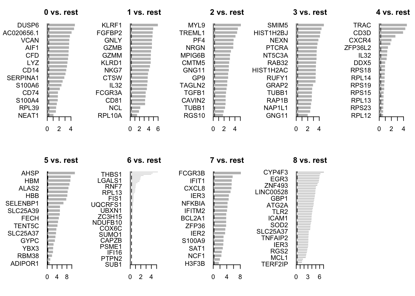 horiz = T, las = 1, main = paste0(i, " vs. rest"), border = "white", yaxs = "i"