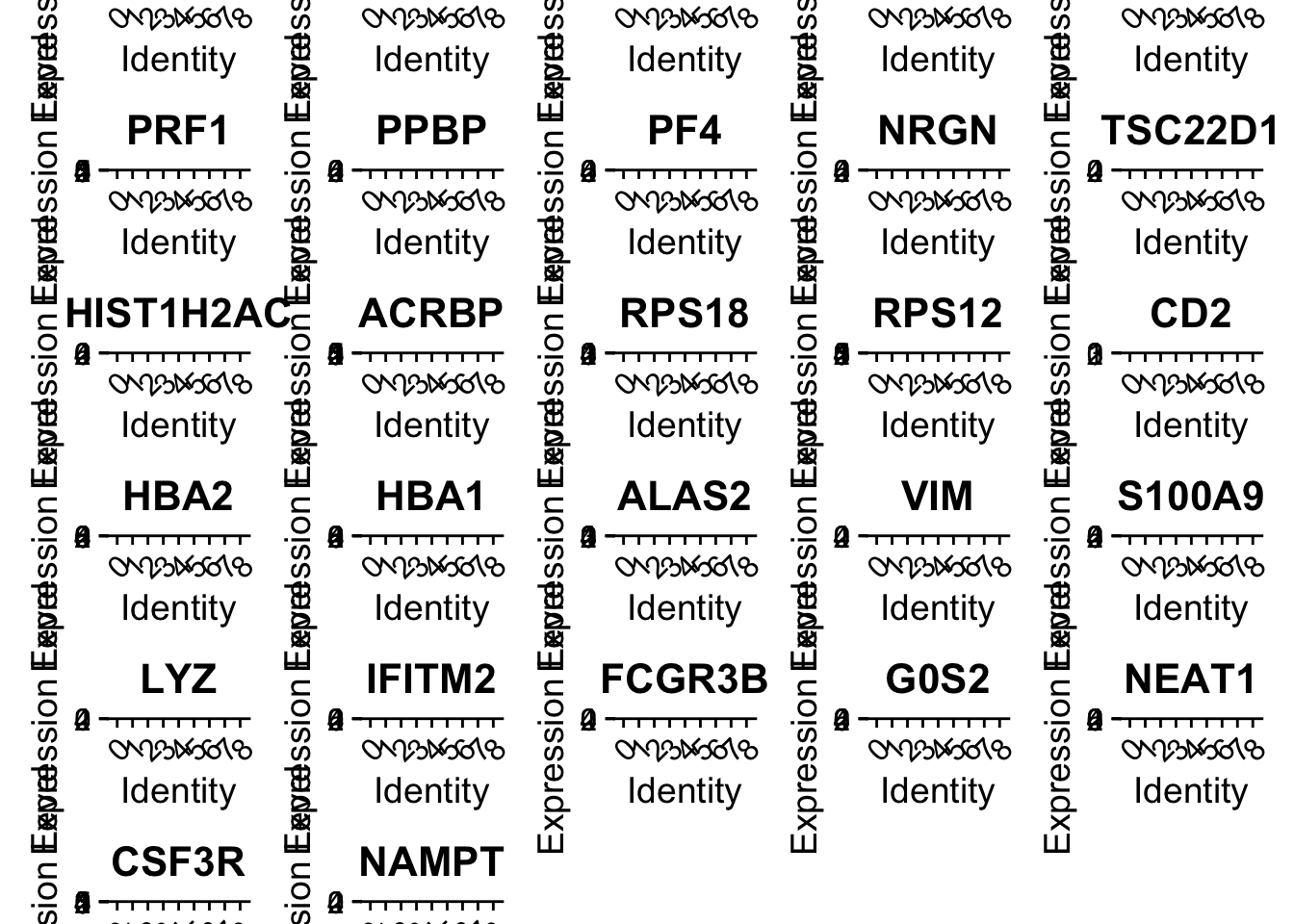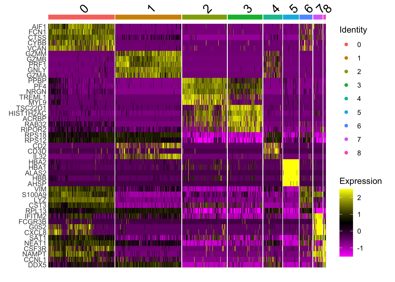 DoHeatmap(alldata_top5, features = as.character(unique(top5$gene)), group.by = sel.clust, assay = "RNA")