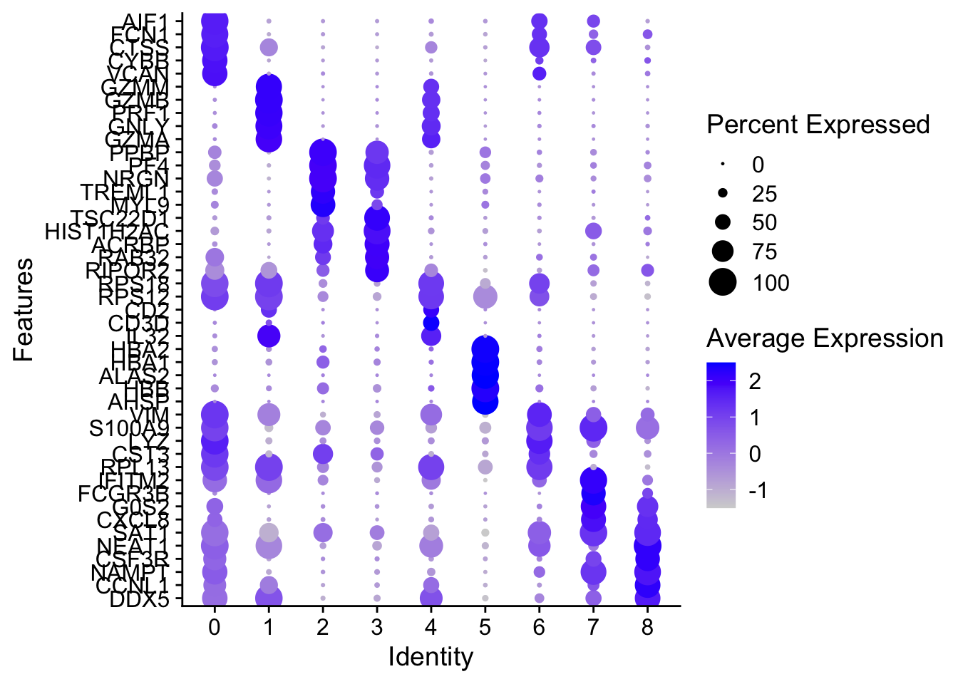 DotPlot(alldata_top5, features = rev(as.character(unique(top5$gene))), group.by = sel.clust, assay = "RNA") + coord_flip()